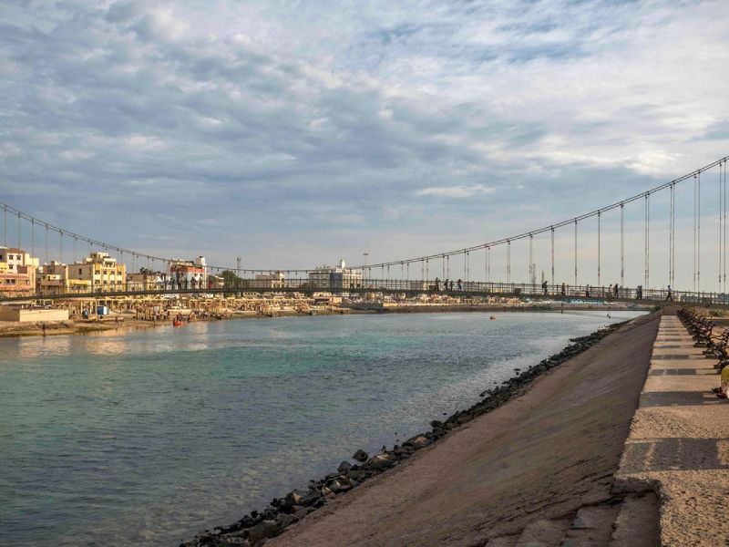Sudama Setu in Sudama Setu, located in the sacred city of Dwarka, is one of the most important spiritual and tourist landmarks of Gujarat. This beautifully designed pedestrian suspension bridge connects the famous Dwarkadhish Temple area with the serene Panchkui Tirth across the holy Gomti River. Named after Sudama, the childhood friend and devoted follower of Lord Krishna, the bridge carries deep mythological and religious significance for pilgrims visiting Dwarka. Stretching elegantly over the Gomti creek, Sudama Setu offers breathtaking panoramic views of the Dwarkadhish Temple spire, Gomti Ghat, and the Arabian Sea meeting the river. Built to provide easier access for devotees, the bridge allows visitors to comfortably walk across while enjoying refreshing sea breezes and scenic surroundings. In the evening, the bridge lights create a peaceful and photogenic atmosphere, attracting pilgrims, photographers, and travelers alike. From the top, visitors can witness temple rituals, fishing boats, and the vibrant spiritual life of Dwarka, making Sudama Setu a must-visit attraction.
